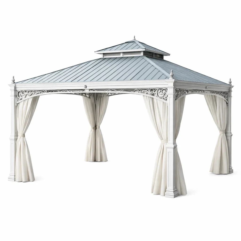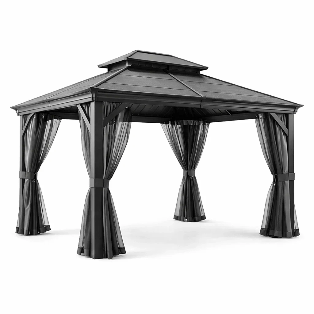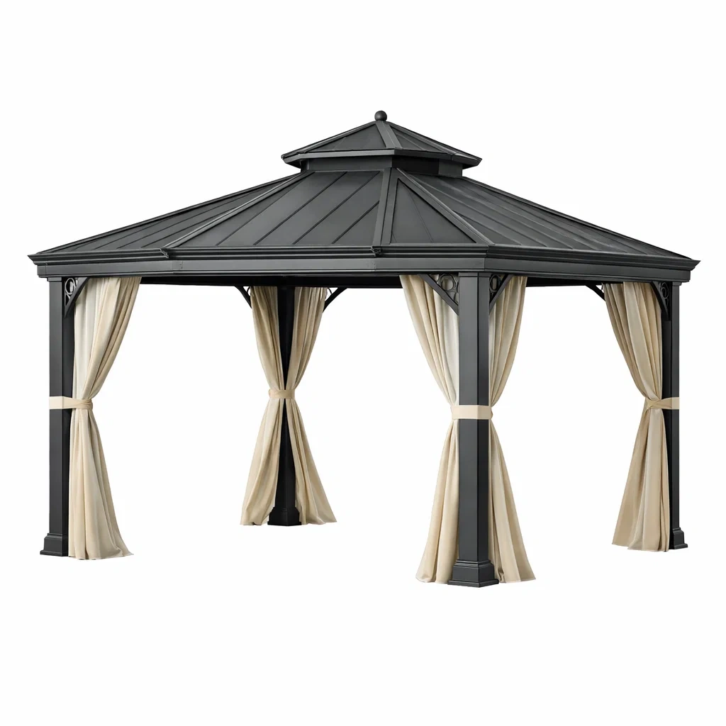 Pavillon en aluminium avec toit en acier et rideaux en polyester
