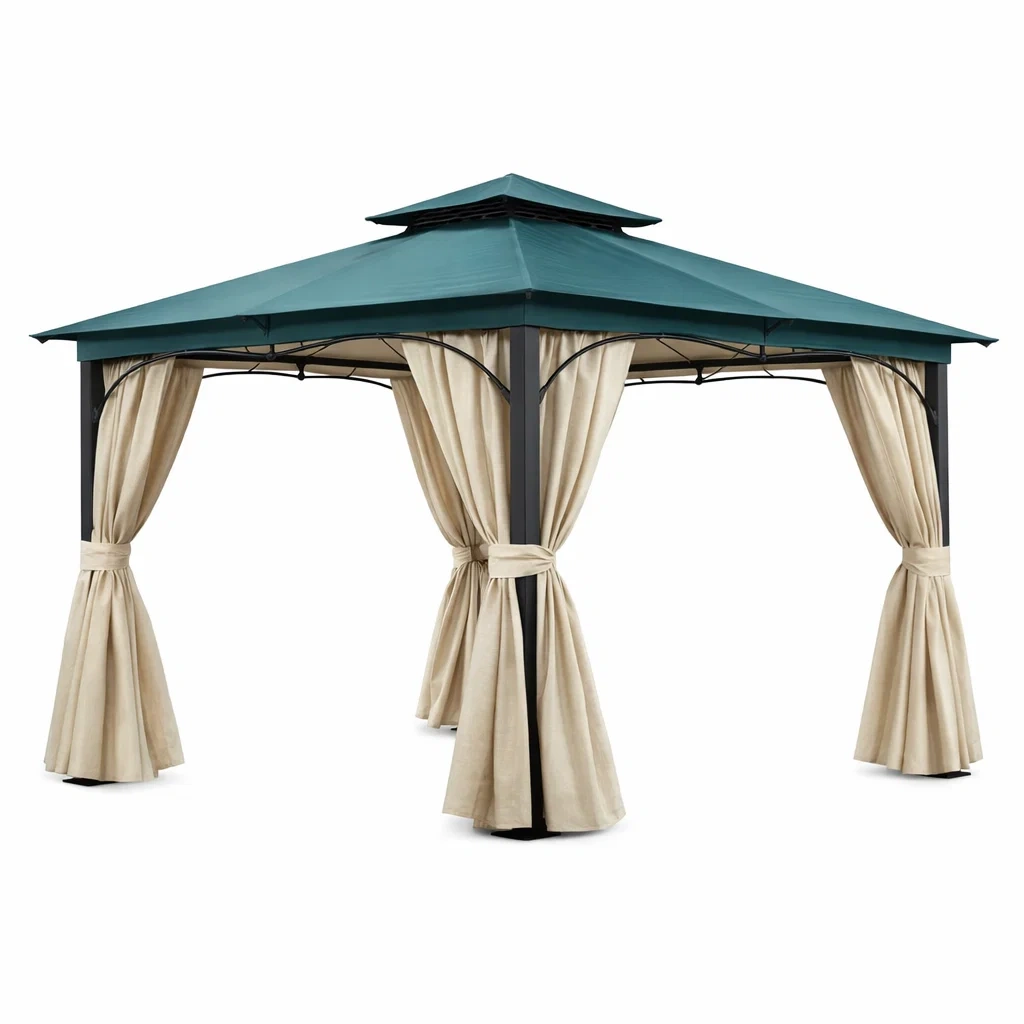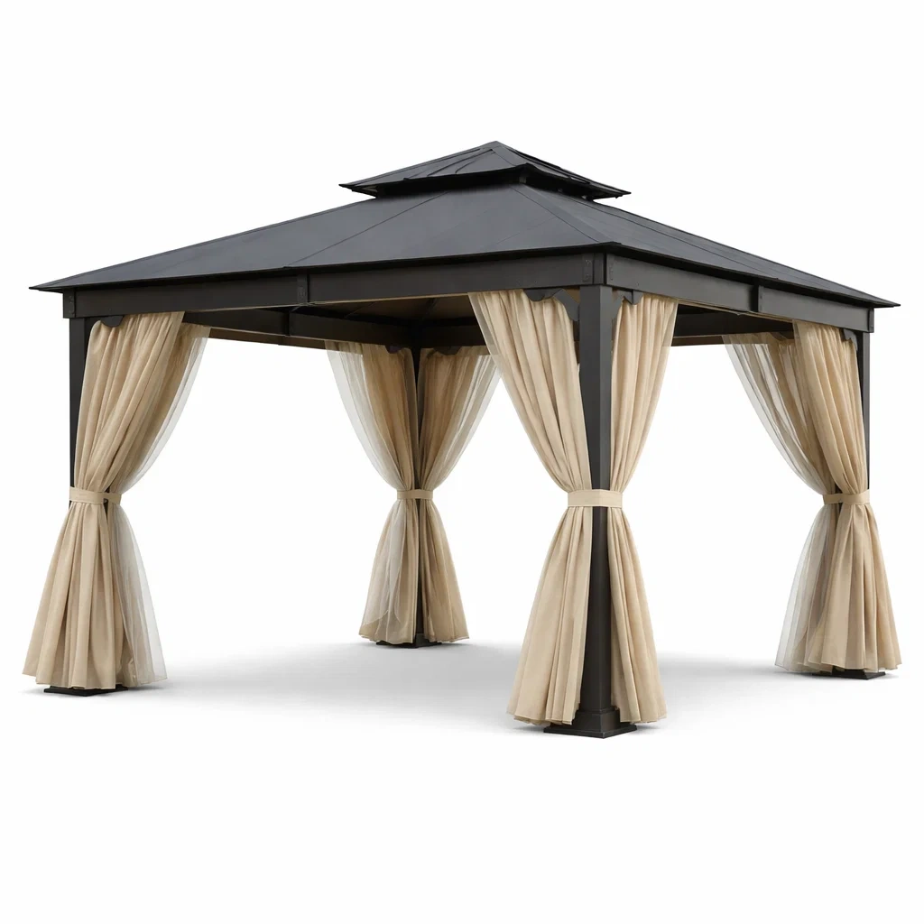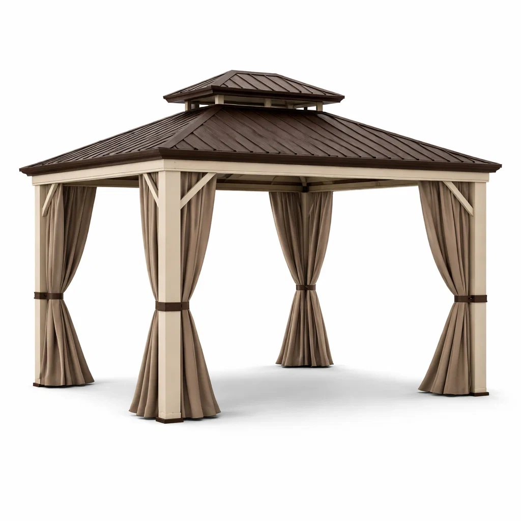 Pavillon de jardin en acier et aluminium avec rideaux en polyester brun