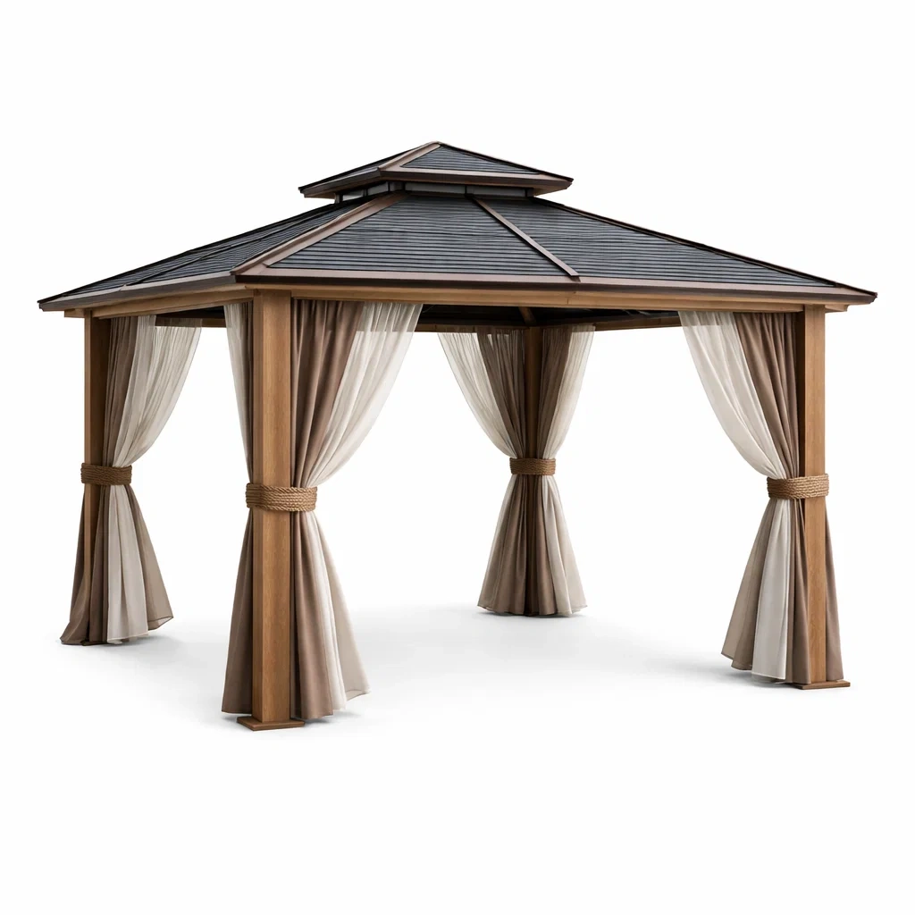 Pavillon de jardin en bois avec toit en acier et rideaux en polyester brun gris