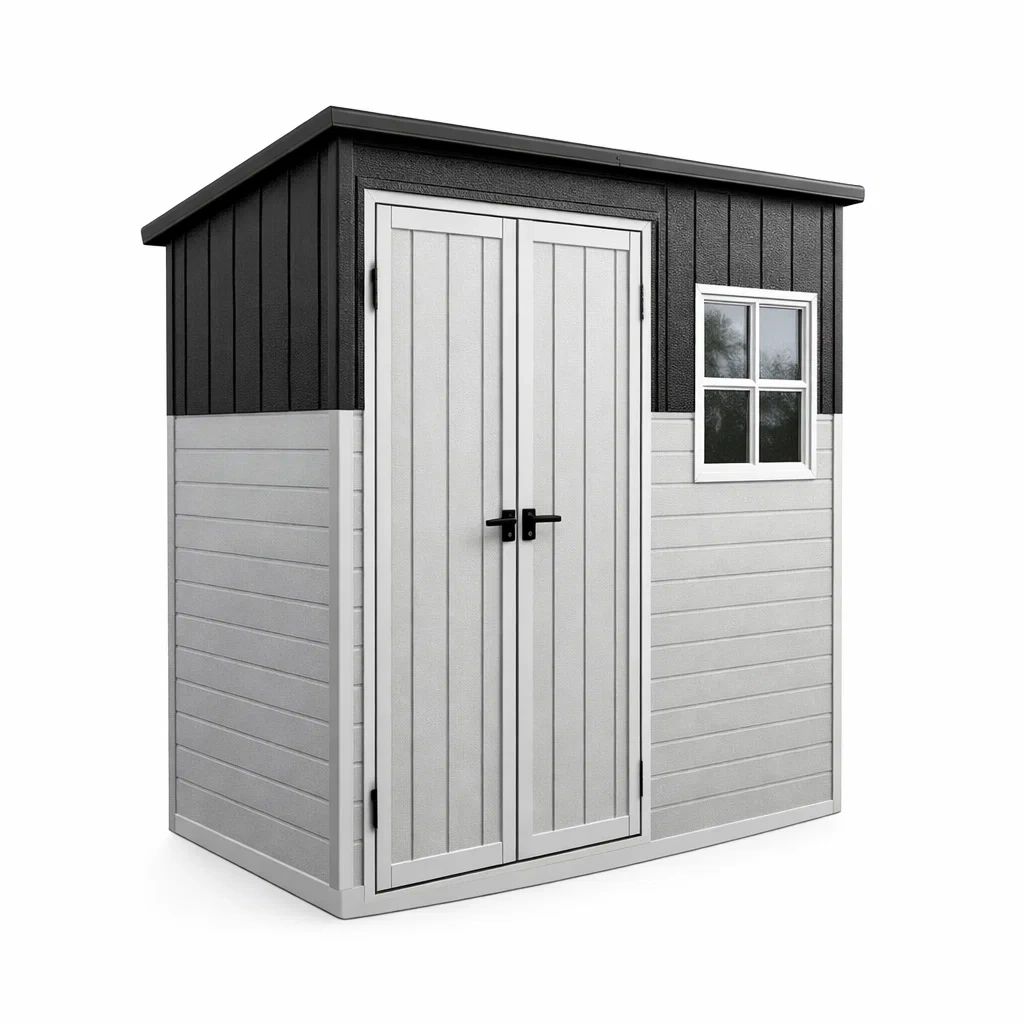 Il dispose d'une fenêtre intégrée et d'une porte double, offrant une résistance aux intempéries. Couleurs en Gris et Noir. Poids total de 45 kg.