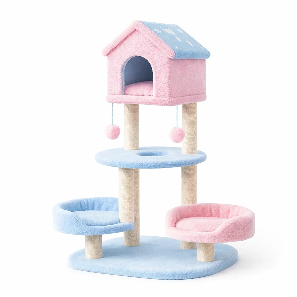 Arbre à chat multi-niveaux composé de colonnes en sisal pour le grattage et de surfaces en peluche douce. Comprend une maison de repos, deux plateformes de repos et deux balles suspendues pour le jeu.