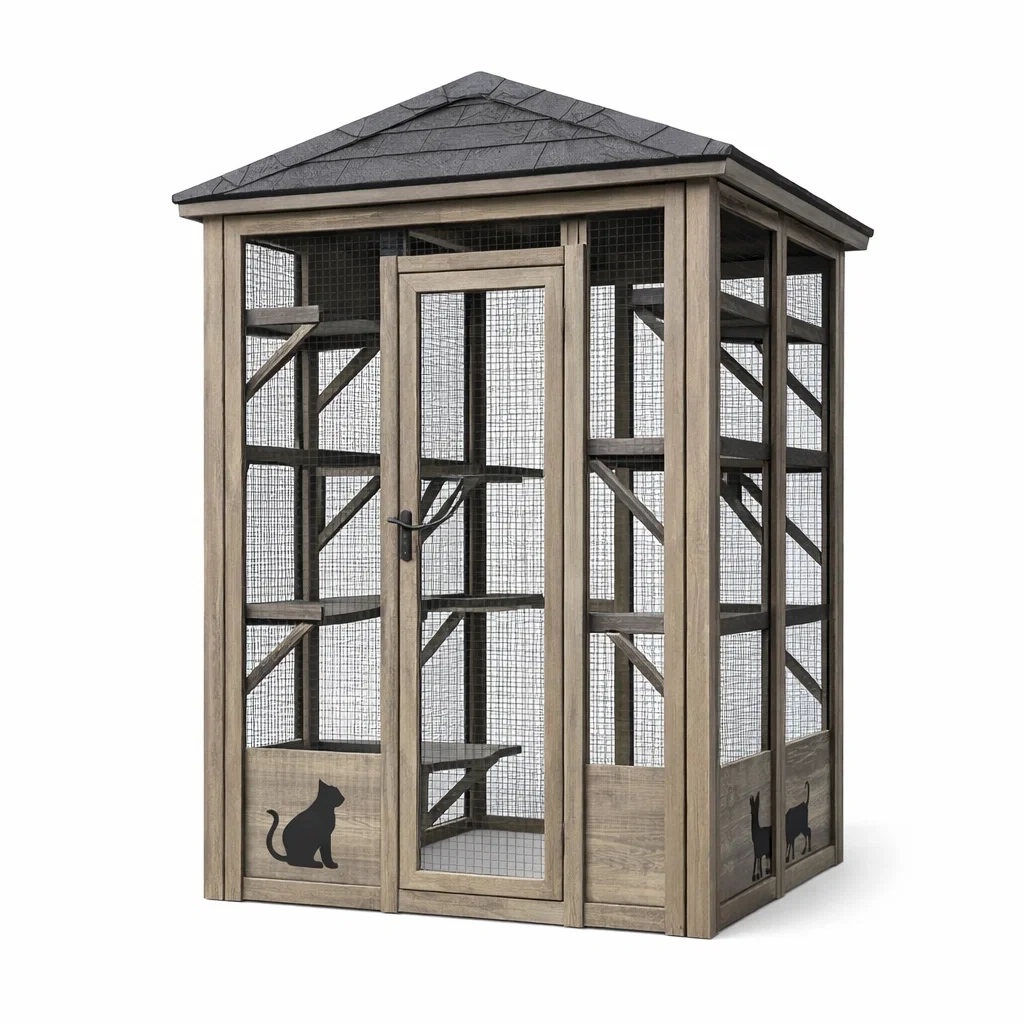 Cette structure est fabriquée en bois de pin avec une maille en acier galvanisé, offrant une résistance à l'eau et aux UV. Les dimensions sont de 130 cm de largeur, 100 cm de profondeur et 170 cm de hauteur. Couleur : Bois naturel et Noir. Poids total : 50 kg.