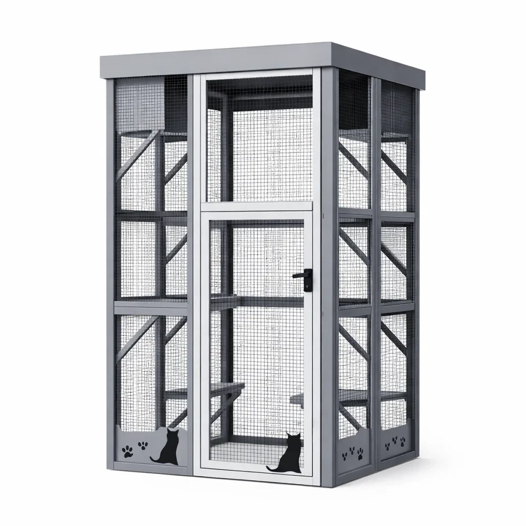 Enclos extérieur pour chats avec structure en acier galvanisé et panneaux en bois. Équipé de grilles en métal pour une visibilité optimale.