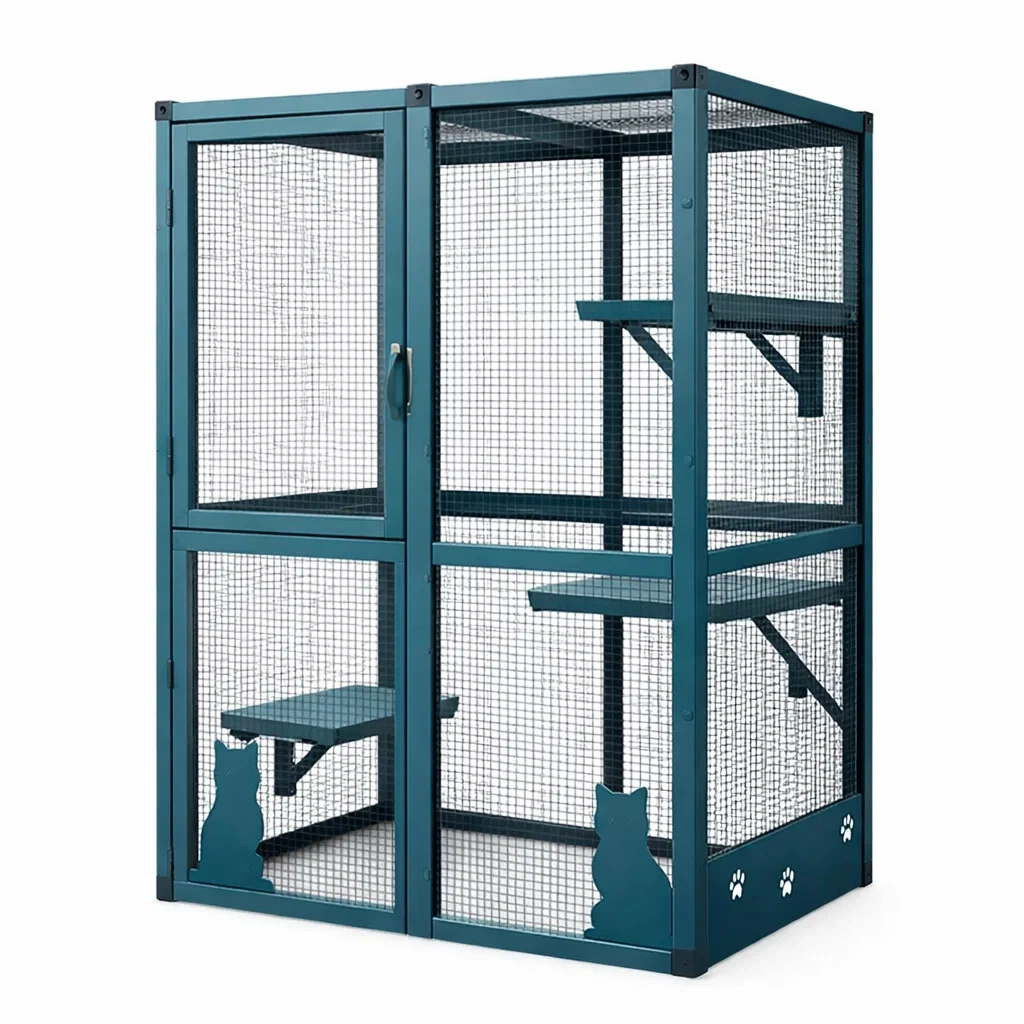 Enclos extérieur pour chats avec armature en métal et panneaux en contreplaqué. Équipé de plusieurs étagères pour le jeu et le repos des chats.