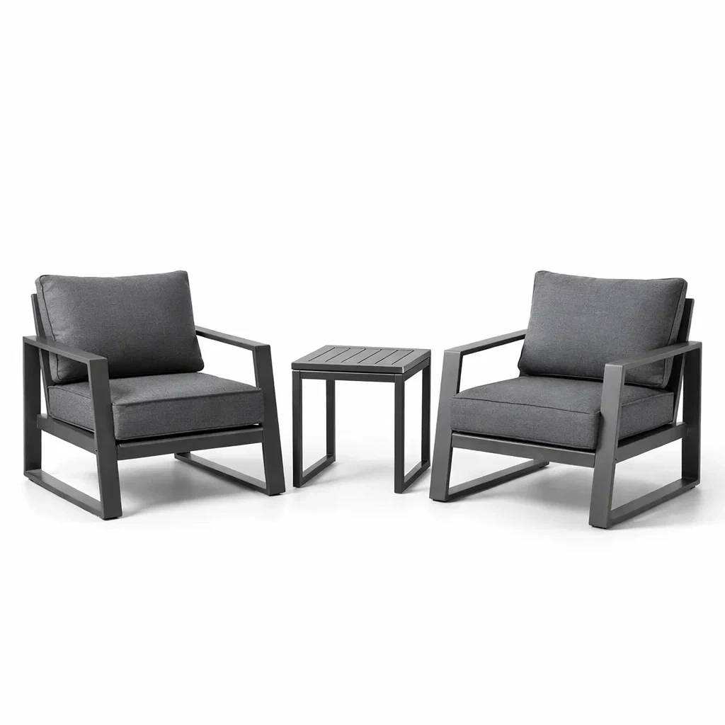 Les fauteuils ont une structure en aluminium avec des coussins en tissu polyester. La table est en aluminium.