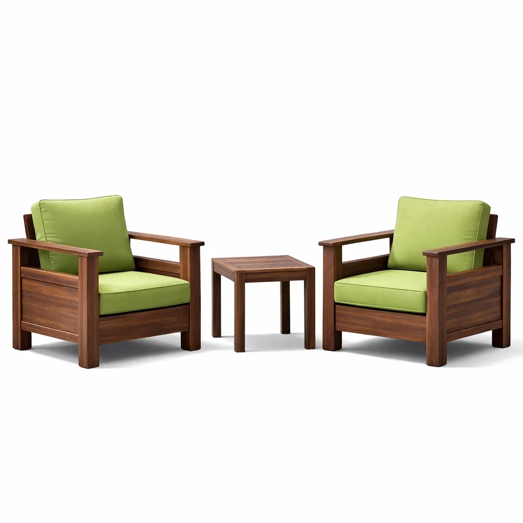 Fabriqué en bois d'acacia massif avec finition teintée. Les coussins sont en tissu polyester vert et remplis de mousse polyuréthane. Structure résistante. Dimensions du fauteuil : L 78 cm x P 81 cm x H 84 cm. Dimensions de la table : L 45 cm x P 45 cm x H 40 cm. Inclus : 2 fauteuils et 1 table.
