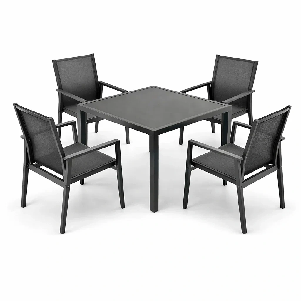 Matériau : Structure en aluminium, Plateau de table en verre trempé, Assise et dossier en textilène
