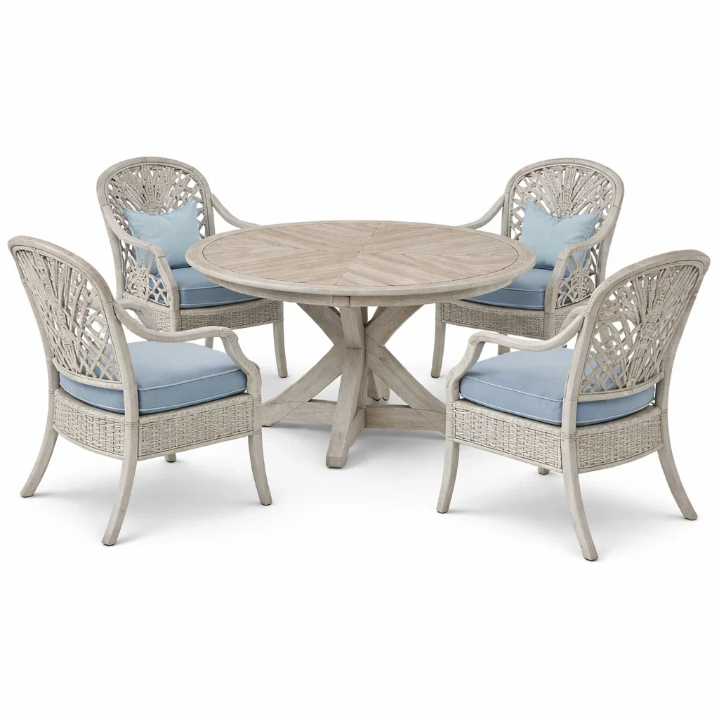Table en bois d'acacia et chaises en rotin synthétique avec coussins en tissu polyester.