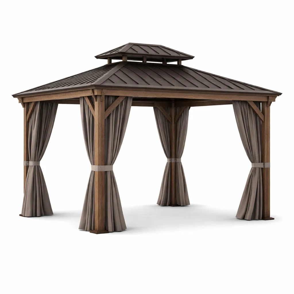 Pavillon de jardin en bois avec toit en acier et rideaux en polyester brun gris